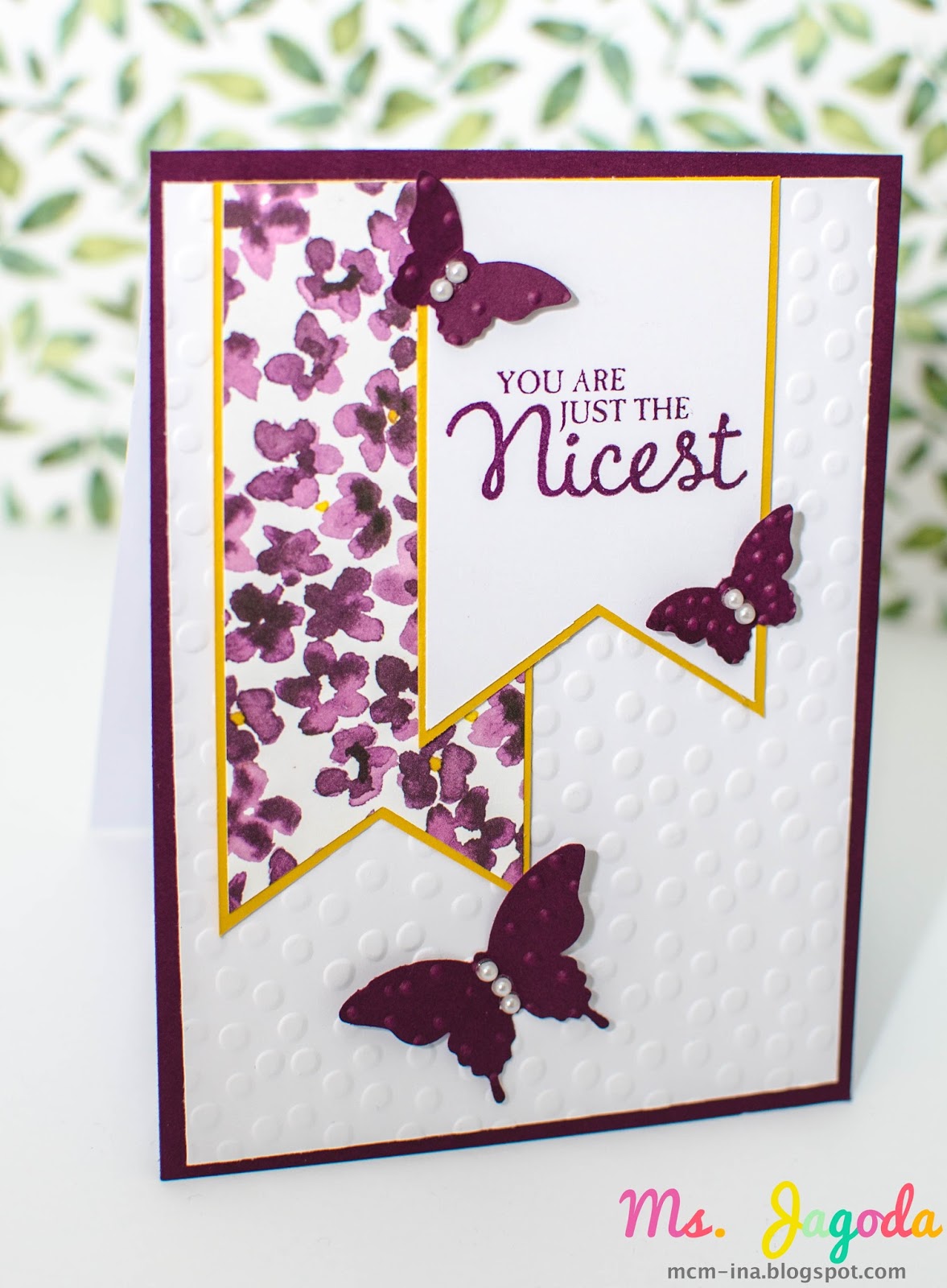 What a wonderfully pretty, well-composed card with the polka-dot embossing woven through your key elements. The delicate flowers and darling butterflies: so lovely! Thank you for sharing your artistry in the ATSM gallery!